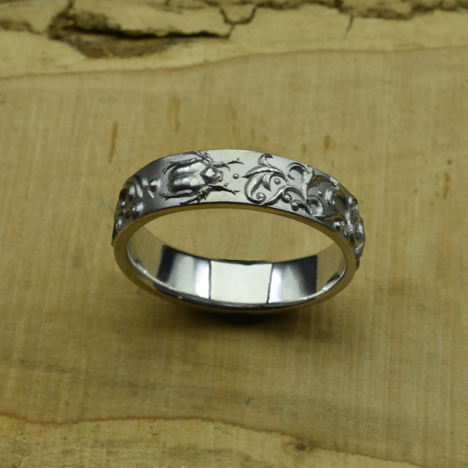 Magnifique anneau en or gris sablé pour une finition mate, personnalisé par des rinceaux sculptés.
