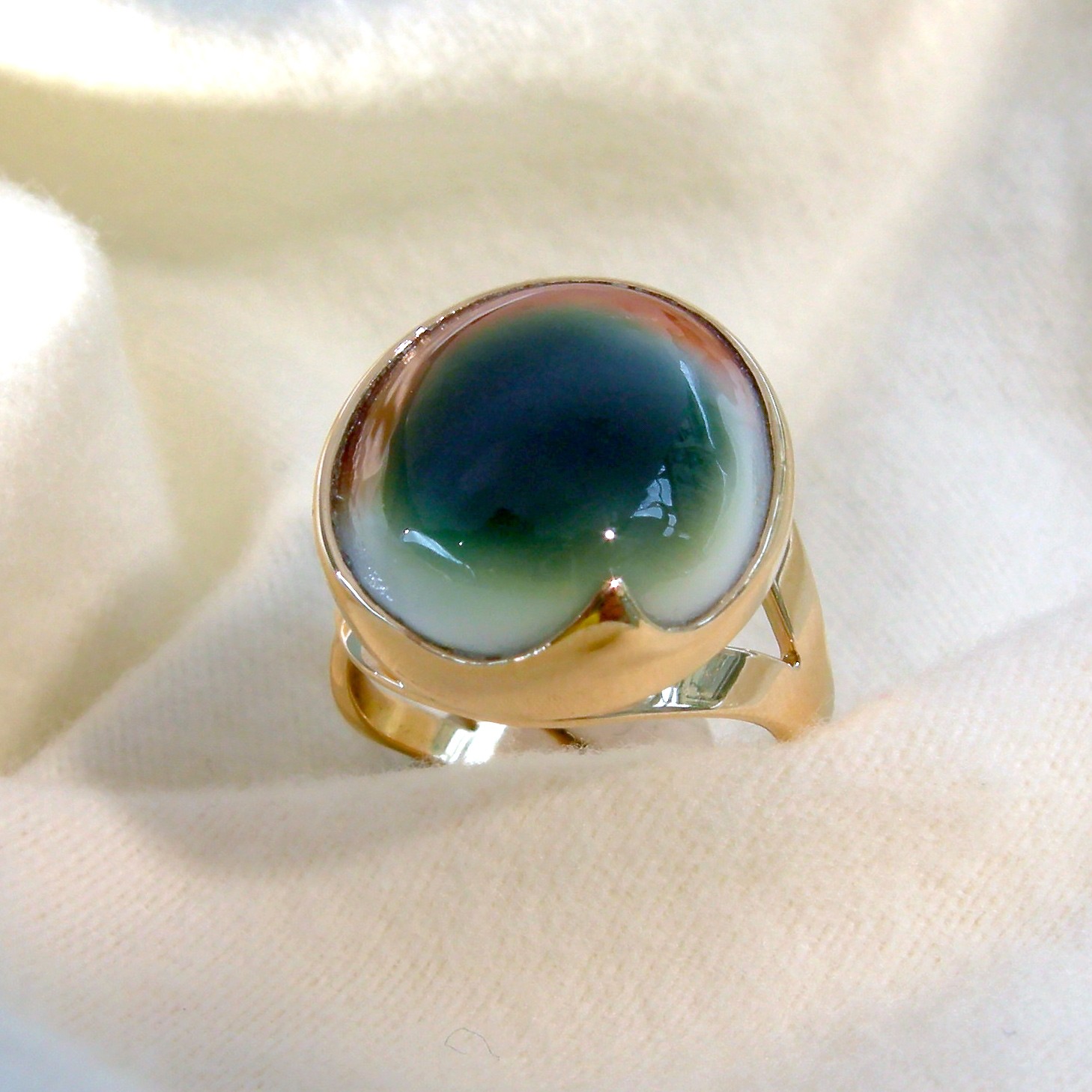 Cette bague en or jaune a été réalisée sur mesure à partir d'une perle fine fournie.